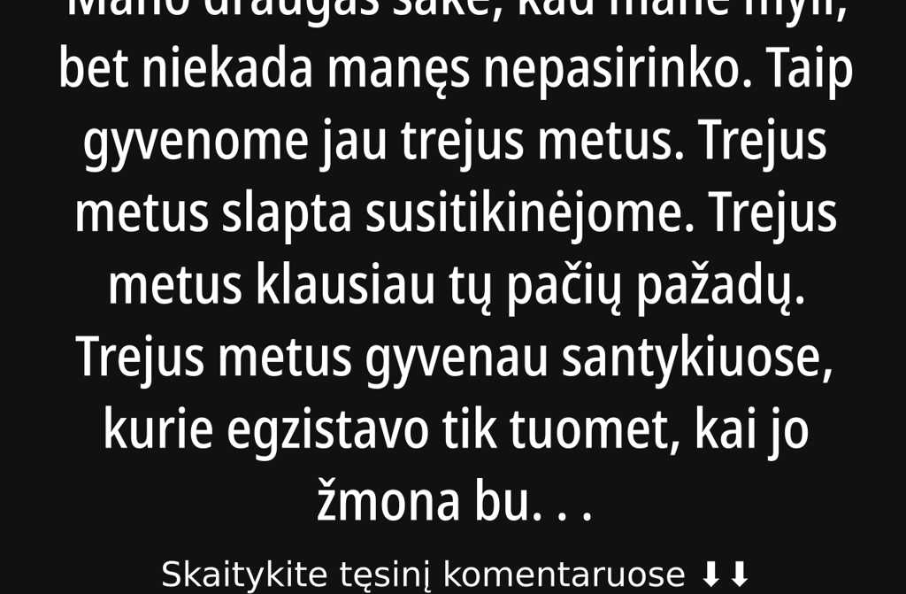 Taip gyvenome jau trejus metus. Trejus metus slapta susitikinėjome. Trejus metus klausiau tų pačių pažadų. Trejus metus gyvenau santykiuose, kurie egzistavo tik tuomet, kai jo žmona buvo toli.