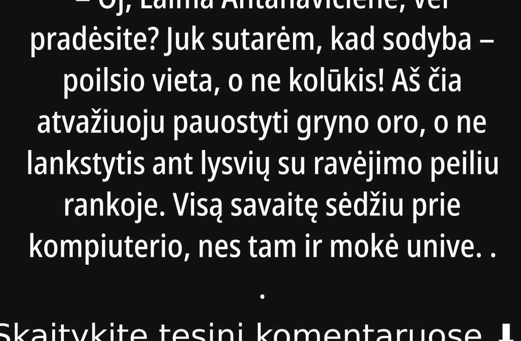 Oj, Laima Antanavičiene, vėl pradėsite? Juk sutarėm, kad sodyba poilsio vieta, o ne kolūkis! Aš čia atvažiuoju pauostyti gryno oro, o ne lankstytis ant lysvių su ravėjimo peiliu rankoje. Visą savaitę sėdžiu prie kompiuterio, nes tam ir mokė universitetą ne tam, kad savaitgaliais daržo darbus dirbčiau. Man, beje, naujas manikiūras, o nugara po ofiso vos neverkia.