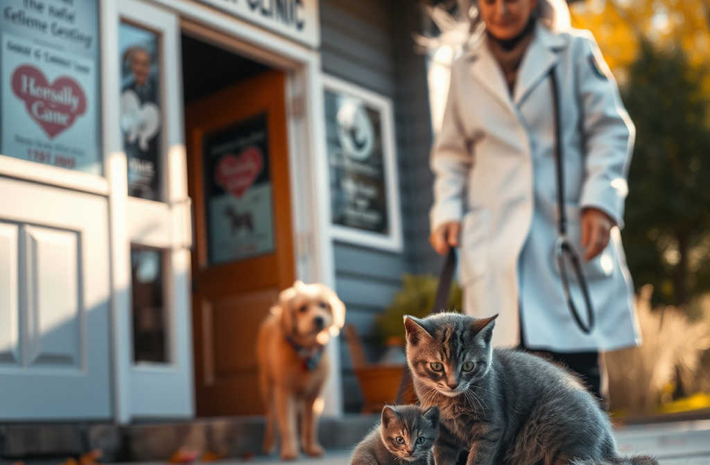 Tamsia pilka katė sėdėjo prie veterinarijos klinikos durų. Verkė, o prie jos kojų gulėjo mažytė kačiukė