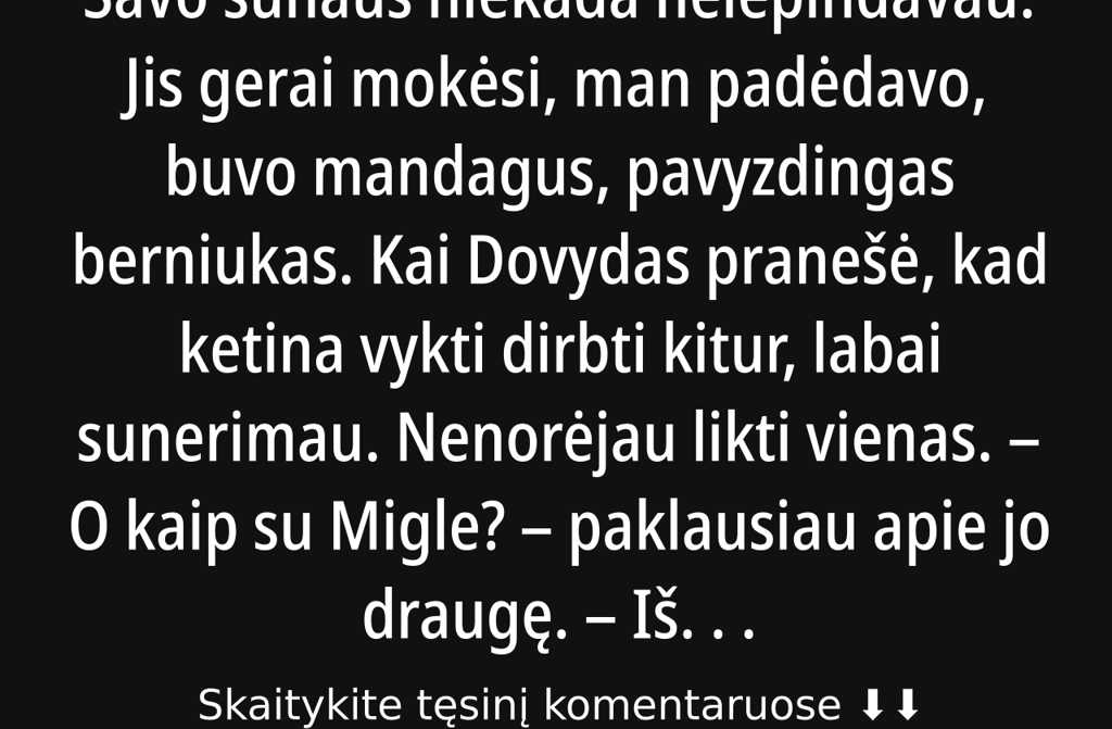 Miglė išėjo į koridorių, ilgai žiūrėjo į Dovydą. Jie visą vakarą kalbėjosi dviese nesikišau į jų pokalbius. Bet svarbiausia, kad po metų jie susituokė, ir abu vaikai augo pilnoje šeimoje.