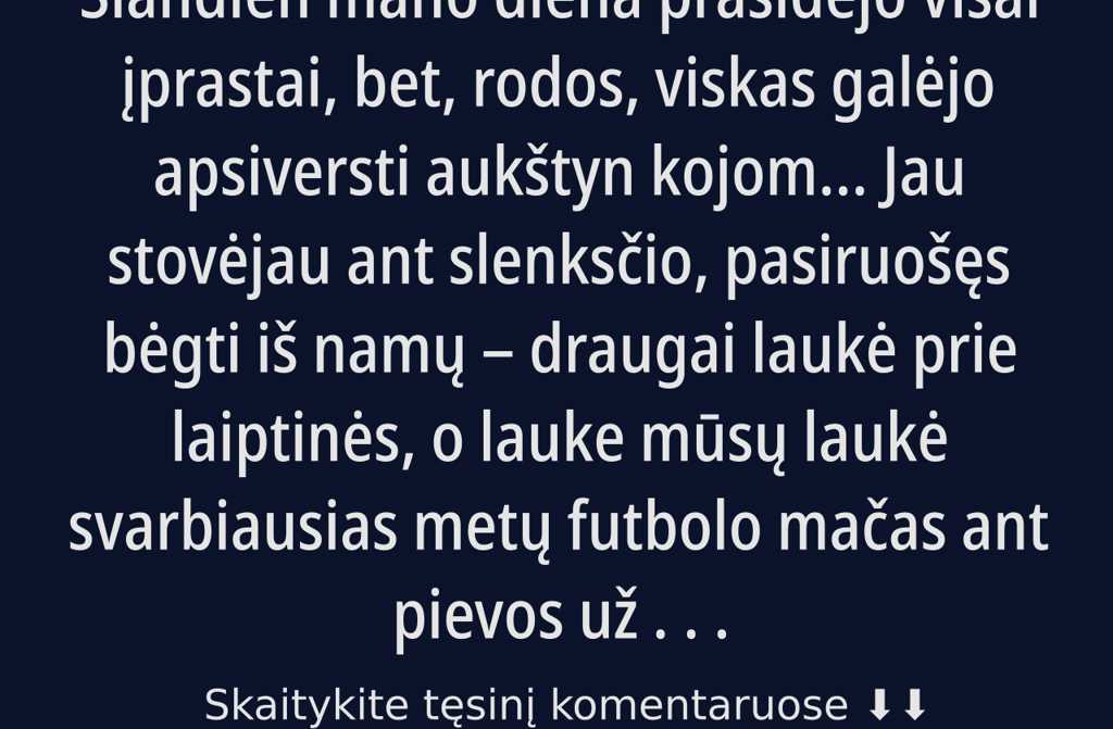 Šiandien mano diena prasidėjo visai įprastai, bet, rodos, viskas galėjo apsiversti aukštyn kojom… Jau stovėjau ant slenksčio, pasiruošęs bėgti iš namų draugai laukė prie laiptinės, o lauke mūsų laukė svarbiausias metų futbolo mačas ant pievos už daugiabučio Santaros rajone, Vilniuje. Prieš kelias minutes greitai paleidau kamuolį, mintyse jau įsivaizduodamas lemiamą įvartį. Ir štai kambaryje suzvimbė telefonas. Kur jau ten norėjosi grįžti, juk vaikinai, žinojau, ilgai nelauks.
