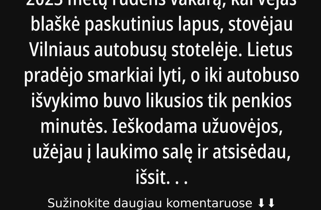2023 metų rudens vakarą, kai vėjas blaškė paskutinius lapus, stovėjau Vilniaus autobusų stotelėje. Lietus pradėjo smarkiai lyti, o iki autobuso išvykimo buvo likusios tik penkios minutės. Ieškodama užuovėjos, užėjau į laukimo salę ir atsisėdau, išsitraukiau telefoną norėjau sužinoti naujienas. Netrukus prie manęs prisėdo energinga senolė Ona Vaitkutė. Pajutau, kad ji labai nori pasikalbėti, tad pradėjome šnekučiuotis apie orą, kuris rudeniškai niūrus, bet ji išsyk nukreipė pokalbį apie save.