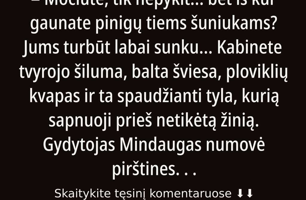 Kabinete tvyrojo šiluma, balta šviesa, ploviklių kvapas ir ta spaudžianti tyla, kurią sapnuoji prieš netikėtą žinią. Gydytojas Mindaugas numovė pirštines ir žiūrėjo į mažą šunytį ant stalo. Tas drebėjo letenėlė buvo suvyniota į kreivai uždėtą skuduriuką, o akys buvo tokios didelės ir drėgnos, lyg nesuprastų, kodėl pasaulis skauda.
