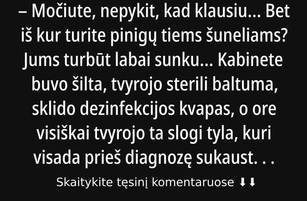 Kabinete buvo šilta, tvyrojo sterili baltuma, sklido dezinfekcijos kvapas, o ore visiškai tvyrojo ta slogi tyla, kuri visada prieš diagnozę sukausto. Daktaras Andrius nusiėmė pirštines ir stebėjo ant stalo gulintį mažą šunelį. Šis drebėjo, viena letena apvyniota sena skiaute, o didelės akys žvelgė taip, lyg šuo visai nesuprastų, kodėl pasaulis jam toks žiaurus.