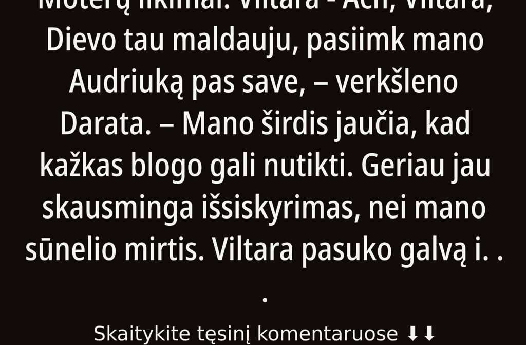 – Ach, Viltara, Dievo tau maldauju, pasiimk mano Audriuką pas save, verkšleno Darata. Mano širdis jaučia, kad kažkas blogo gali nutikti. Geriau jau skausminga išsiskyrimas, nei mano sūnelio mirtis.