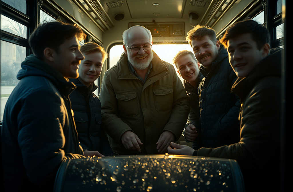 Tuo metu, konduktorė, kurios akiniai buvo senesni už pačius vaikinus, pakilo nuo savo vietos. Grakščiai, bet griežtai, suspaudusi laimingų bilietėlių pluoštą rankoje, ji priartėjo prie šėlstančių.