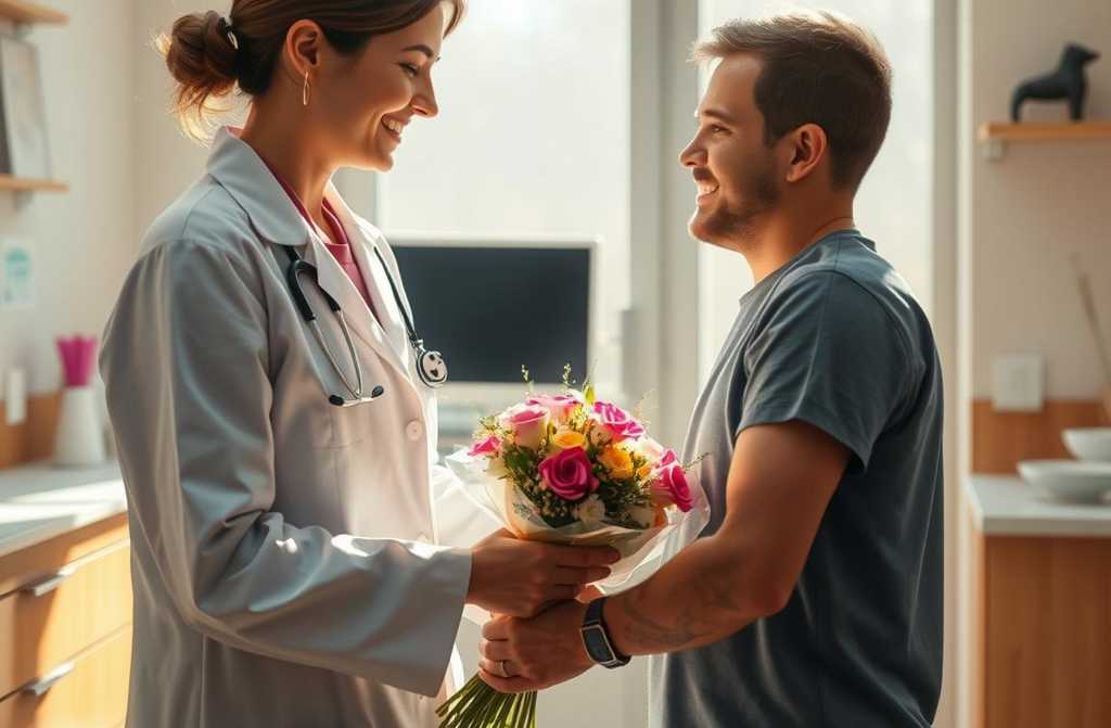 Pirmadienį prie klinikos šalia Protas vaikščiojo su dideliu gėlių puokšte, žiūrėjo į laikrodį. Kolegoms tai buvo neįprasta, jie stebėjo jį su smalsumu. Kai aš priėjau su šypsena, jis išdujo man gėlę ir pasakė: Labas rytas, ačiū, kad nepavojavote injekcijos. Norėčiau susitikti vakare kavinėje.