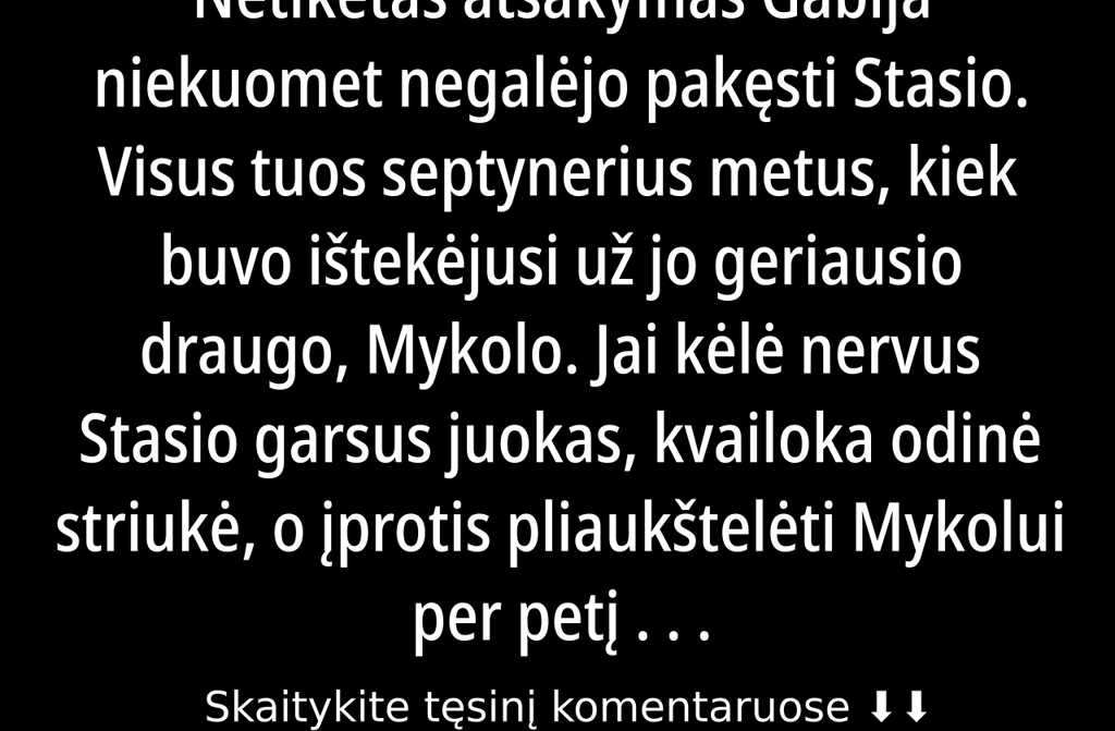 Kaip draugas, pridūrė Gabija, ir pirmą kartą jos balse skambėjo ne ledas, o kažkas šilto, gyvo. Kaip geriausias Mykolo draugas. Kol kol nesupyksi.