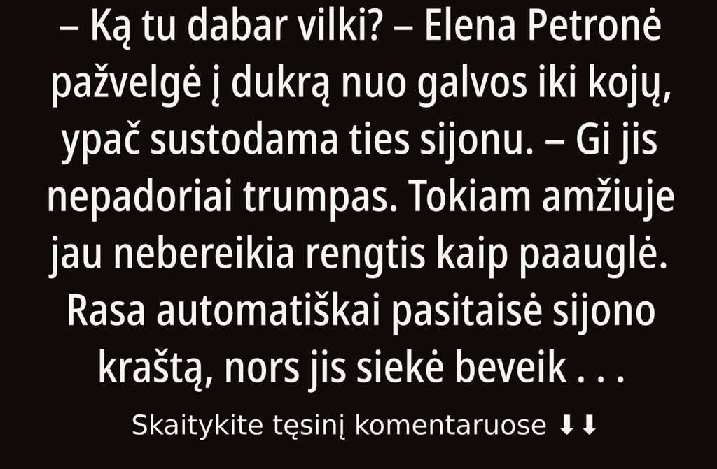 Ką tu dabar vilki? Elena Petronė pažvelgė į dukrą nuo galvos iki kojų, ypač sustodama ties sijonu. Gi jis nepadoriai trumpas. Tokiam amžiuje jau nebereikia rengtis kaip paauglė.