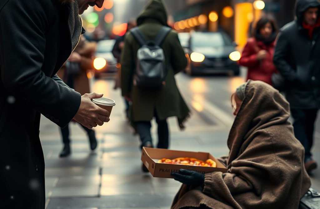 – Ar nori pavalgyti? – išsprūdo man netikėtai net sau pačiam. Jis lėtai pakėlė galvą, pažvelgė nepasitikinčiai, lyg tikrindamas, ar tai ne patyčios, ir linktelėjo: „Taip… jei nesunku“. Įėjau į kavinę, užsisakiau didelę sūrio picą ir karštos kavos puodelį. Kol laukiau, pro stiklo langą stebėjau jį – vienišą siluetą apgaubiančiuose prieblandoje. Grįžęs, padaviau maistą. Jo lūpos vos judėjo nuo menkos šypsenos: „Ačiū“, – sušnabždėjo jis, priimdamas dėžutę drebančiais, pamėlusiais pirštais.