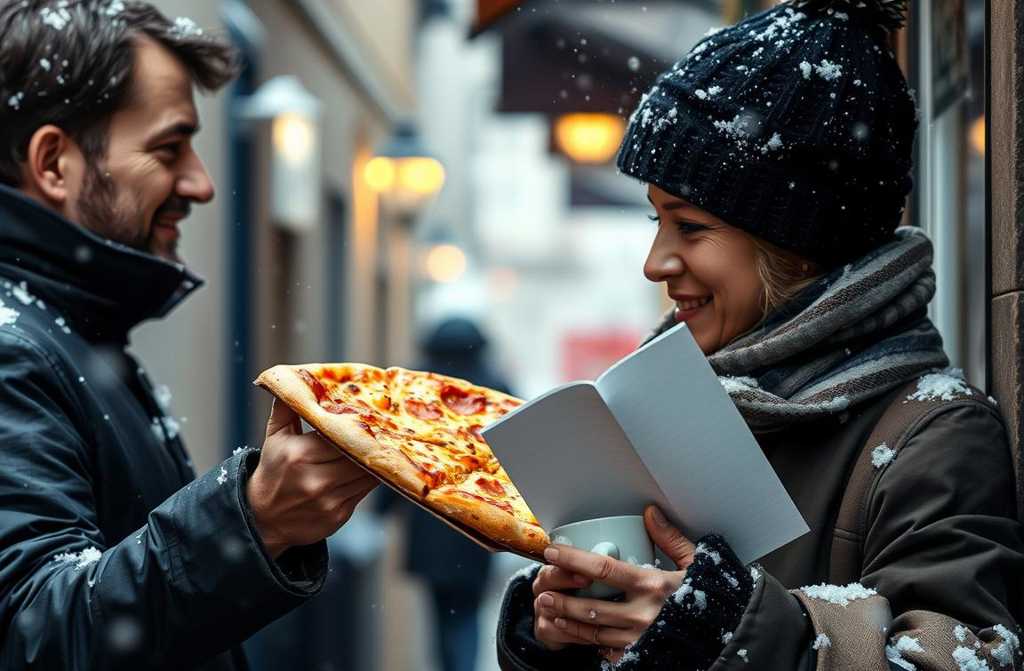„Ar norėtum ko nors valgyti?“ – iš lėto paklausiau, netikėdamas pats savo žodžių. Jis lėtai pakėlė galvą, žvilgtelėjo nepasitikėjimo, lyg tikrindamas, ar tai ne pokštas, ir linktelėjo: „Taip… jei ne per sunku“. Ėjau į kavinę, užsisakiau didelę pica su sūriu ir karštą kavą. Laukdamas žiūrėjau pro langą į jo vienatvę tamsėjančiuose sutemose. Grįžęs įdaviau maistą. Jo lūpos sudrebėjo silpnoje šypsenoje: „Ačiū“, – sušnibždėjo jis, imdamas dėžutę šiurpiančiais, pamėlynusiais pirštais.