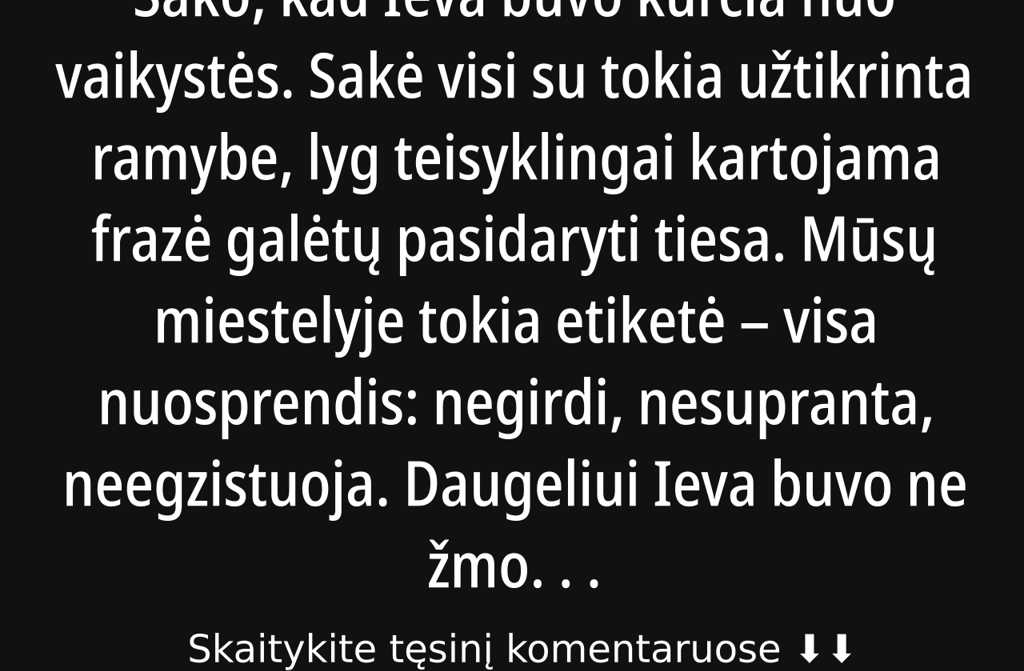 Sakė visi su tokia užtikrinta ramybe, lyg teisyklingai kartojama frazė galėtų pasidaryti tiesa. Mūsų miestelyje tokia etiketė visa nuosprendis: negirdi, nesupranta, neegzistuoja. Daugeliui Ieva buvo ne žmogus, o tylus nepatogumas, kurį reikia iš kampo į kampą perstumti.