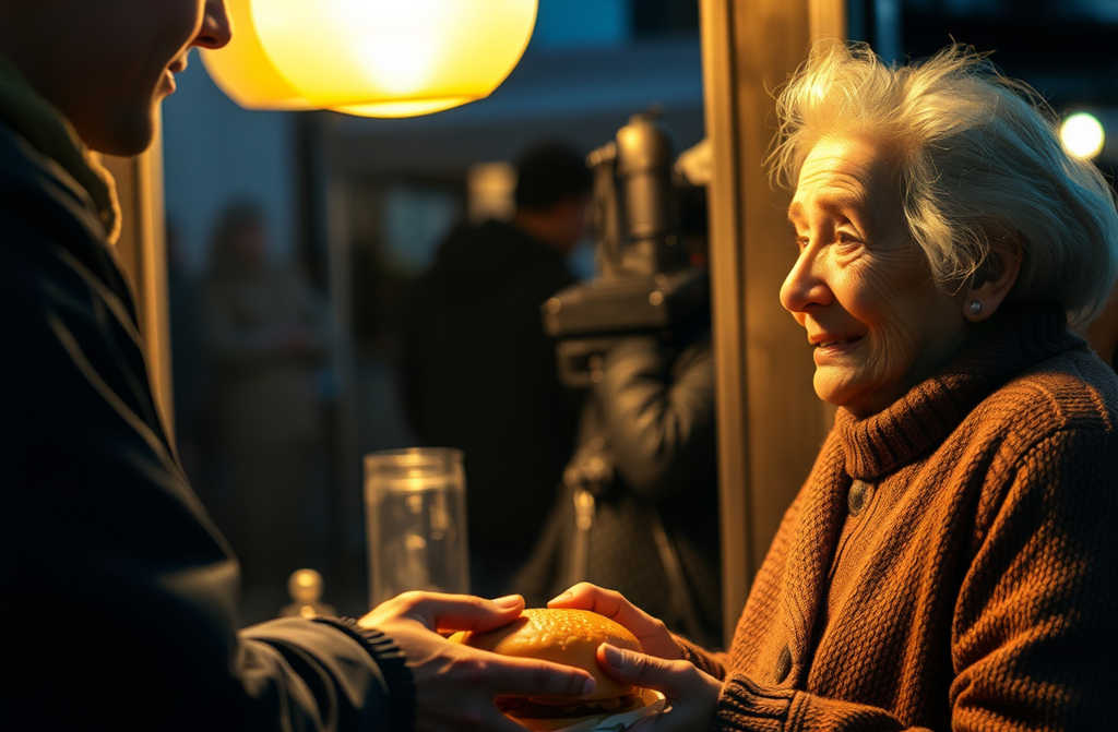 Jaunas vyrukas, stovintis prie mėsainių vagonėlio, sustojo. Miesto triukšmas trumpam nuslopė. Jis pažvelgė į jos drebančią ranką ir banknotą, kuris kalbėjo daugiau nei tūkstantis žodžių. Jo mintys šoktelėjo į ankstesnę laiką, į savo močiutę, kuri jį augino.