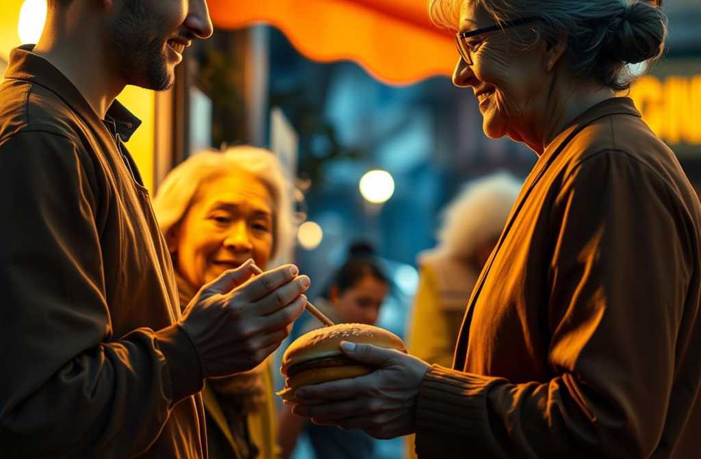 Ji atvyko į miestą tik dėl ligoninės, ne po gurmano malonumų. Išsekusi, alkanti ir galvojančia apie sergančią vyro sielą, sustojo prie maisto traukinio su mėsainiais, akimis kaip vaikas. Penki eurai rankoje, noras širdyje ir didelė gėdos jausena: prašyti sau, būnant tokio amžiaus, po gyvenimo, kai visada duodavai kitiems, nėra lengva.