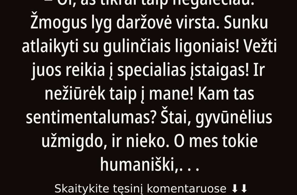 Oi, aš tikrai taip negalėčiau. Žmogus lyg daržovė virsta. Sunku atlaikyti su gulinčiais ligoniais! Vežti juos reikia į specialias įstaigas! Ir nežiūrėk taip į mane! Kam tas sentimentalumas? Štai, gyvūnėlius užmigdo, ir nieko. O mes tokie humaniški, kad net juokinga. Kažkurioje šalyje senelius į girią išneša, toli nusiveda ir palieka. O dar norėjo pratęsti Antanina, bet Lijana ją pertraukė: