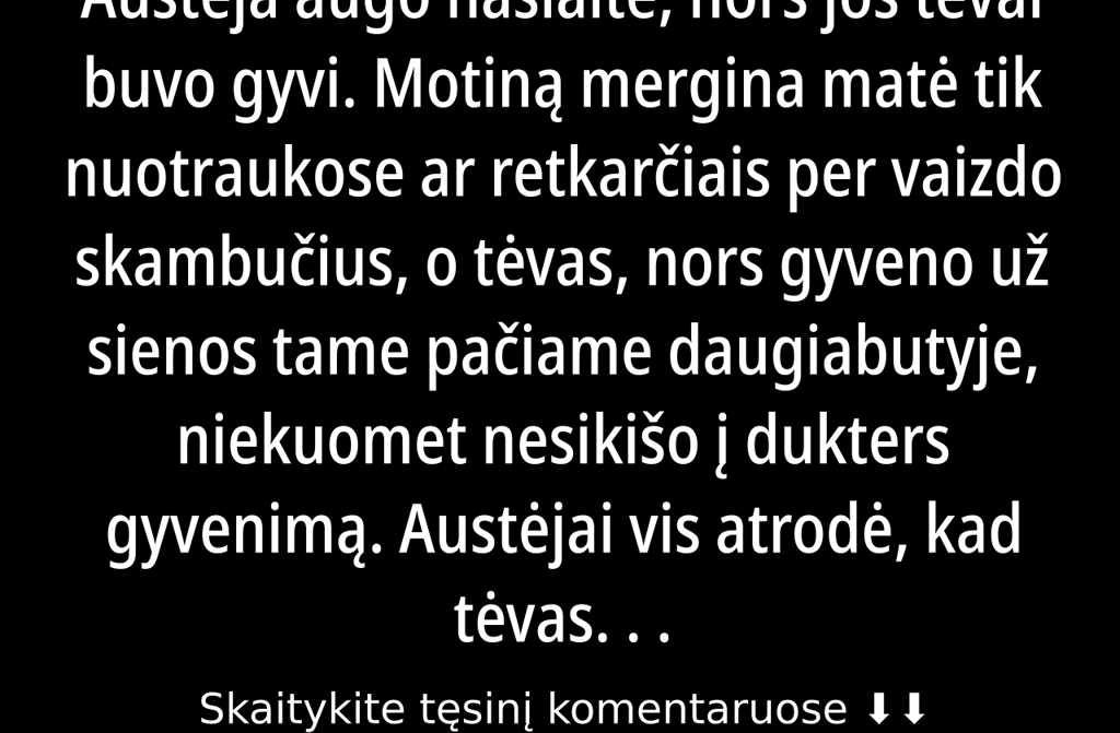 Austėja augo našlaite, nors jos tėvai buvo gyvi. Motiną mergina matė tik nuotraukose ar retkarčiais per vaizdo skambučius, o tėvas, nors gyveno už sienos tame pačiame daugiabutyje, niekuomet nesikišo į dukters gyvenimą. Austėjai vis atrodė, kad tėvas jos vengia, bijo net žvilgtelėti į akis, tarsi bijotų, kad paprašys kokios pagalbos ar dėmesio.