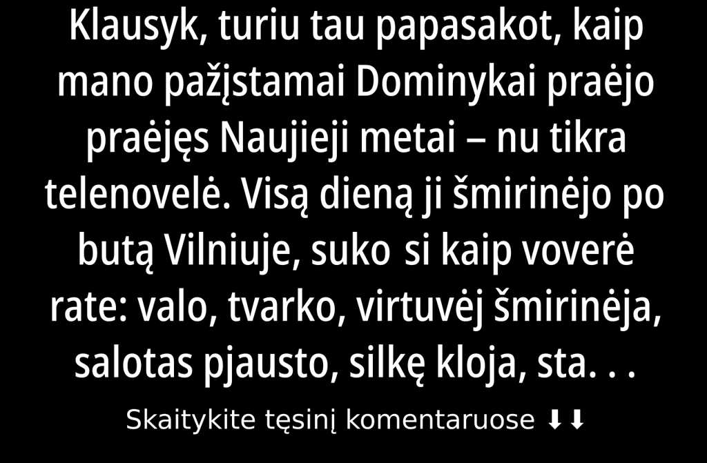 Visą dieną ji šmirinėjo po butą Vilniuje, sukosi kaip voverė rate: valo, tvarko, virtuvėj šmirinėja, salotas pjausto, silkę kloja, stalo servetėles dėlioja nu, viskas, kad tik šventei pasiruoštų. Pirmi jos Nauji be tėvų, su mylimu žmogu Mindaugu. Jau trečias mėnuo pas jį gyvena nuomojasi kartu Justiniškėse. Mindaugas vyresnis už ją penkiolika metų, buvo vedęs, vaikui moka alimentus, dar kartais mėgsta per šventes taurelę pakelt… Bet kai myli žmogų, visos tos smulkmenos, žinai, nublanksta. O dar aplinkiniai stebėjosi, kaip ji taip jį įsimylėjo nei gražuolis, nei koks iškalbus, veidą galėtum pagal žodyną ne pirmo grožio pavyzdžiu parodyti, charakterio kaip ožys, pinigus saugo kaip voverė riešutus, per daug neduoda, na, bet Dominykai tikra meilė.
