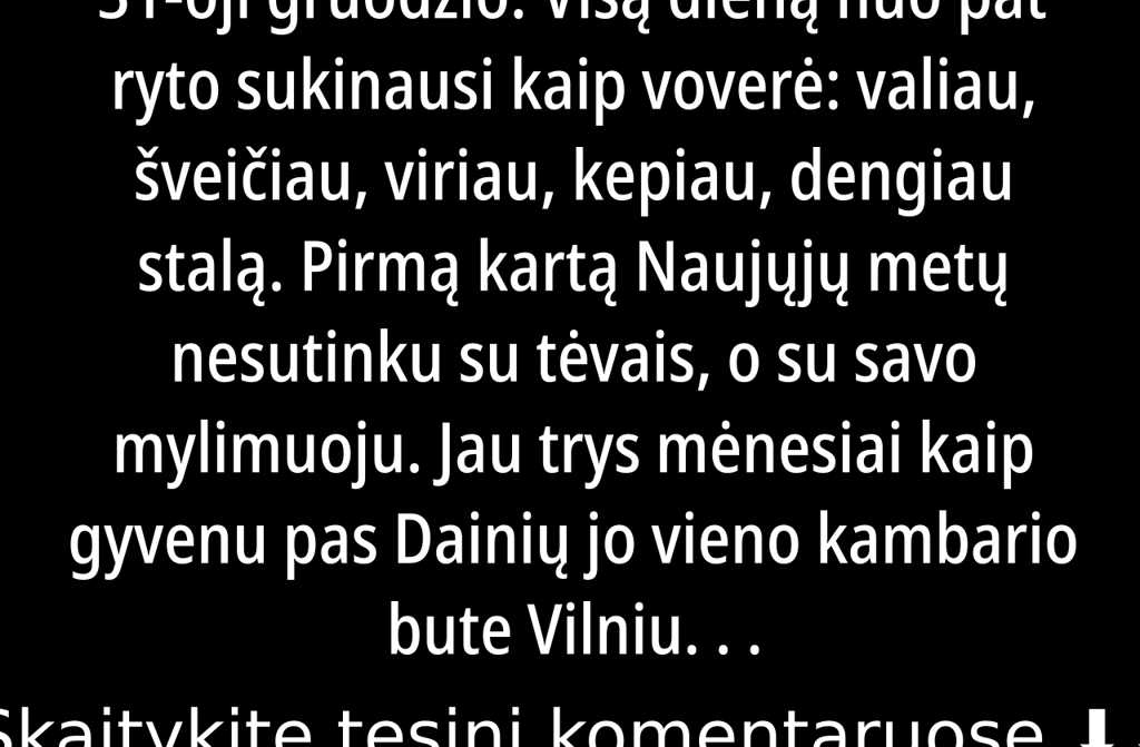 Kol aš tvarkiausi namie, Dainius irgi ruošėsi – tik savaip. Susitiko su draugais, išgėrė kaip reikiant. Grįžo girtas, dar net stipriau nei įprastai, ir džiaugsmingai pasakė, kad į mūsų naujametinį vakarėlį atvyks jo draugai keista kompanija, kurios aš net pažinojau nesu. Likus vos valandai iki vidurnakčio, aš viską padariau stalą paserviravau, tortą iškepiau, net ledų nupirkau. Nuotaika buvo subjurusi, bet stengiausi laikytis, juk nenoriu būti kaip jo buvusi.