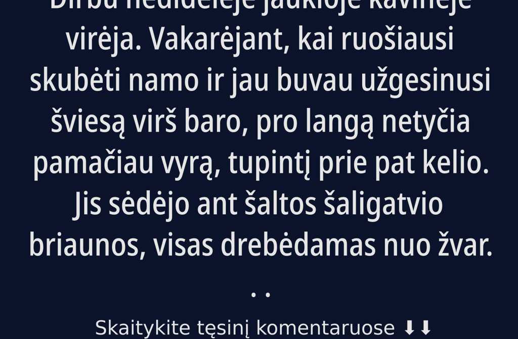 Dirbu nedidelėje jaukioje kavinėje virėja. Vakarėjant, kai ruošiausi skubėti namo ir jau buvau užgesinusi šviesą virš baro, pro langą netyčia pamačiau vyrą, tupintį prie pat kelio.