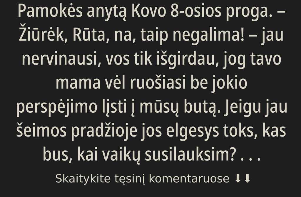 Žiūrėk, Rūta, na, taip negalima! jau nervinausi, vos tik išgirdau, jog tavo mama vėl ruošiasi be jokio perspėjimo lįsti į mūsų butą. Jeigu jau šeimos pradžioje jos elgesys toks, kas bus, kai vaikų susilauksim? Ji gi apsigyvens pas mus, iš vis neišeis. Nei gyvenimo ji mums neduos! piktinausi aš, išgirdęs Rūtos pasakojimą.