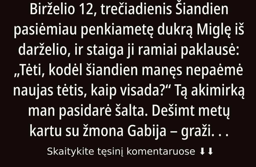Šiandien pasiėmiau penkiametę dukrą Miglę iš darželio, ir staiga ji ramiai paklausė: Tėti, kodėl šiandien manęs nepaėmė naujas tėtis, kaip visada?