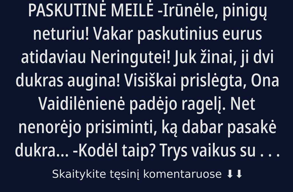 -Irūnėle, pinigų neturiu! Vakar paskutinius eurus atidaviau Neringutei! Juk žinai, ji dvi dukras augina!