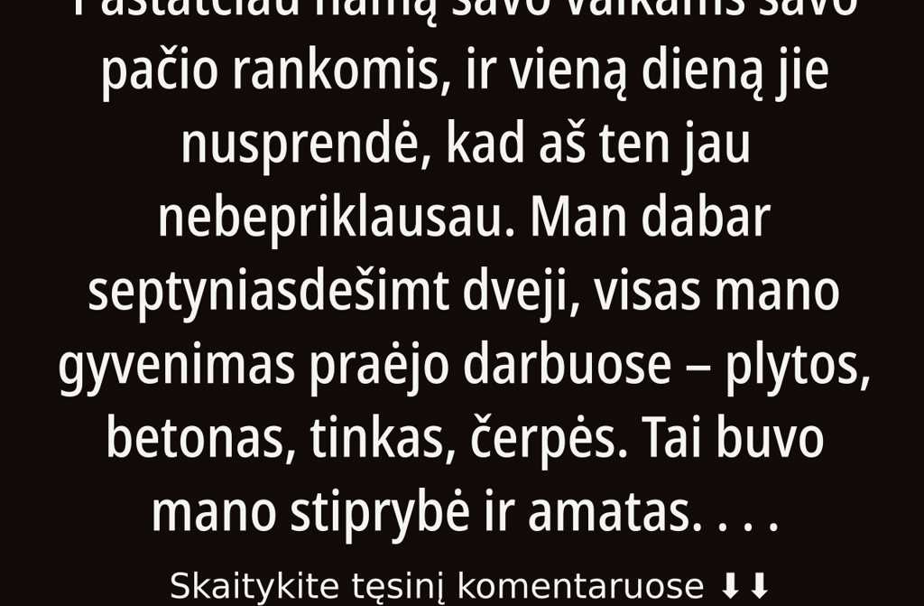Pastatčiau namą savo vaikams savo pačio rankomis, ir vieną dieną jie nusprendė, kad aš ten jau nebepriklausau. Man dabar septyniasdešimt dveji, visas mano gyvenimas praėjo darbuose plytos, betonas, tinkas, čerpės. Tai buvo mano stiprybė ir amatas.