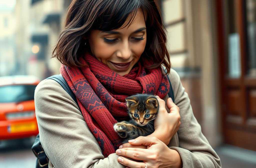 Dvejonės išnyko ji negalėjo jo palikti. Katinas drebėjo, šlapias iki kaulų. Ji apvyniojo jį savo baltu šaliku ir paskubėjo link autobuso. Nusprendė jį pasiimti į darbą, o vėliau galvos, ką daryti toliau. Jos šilta širdis negalėjo palikti šio našlaičio.