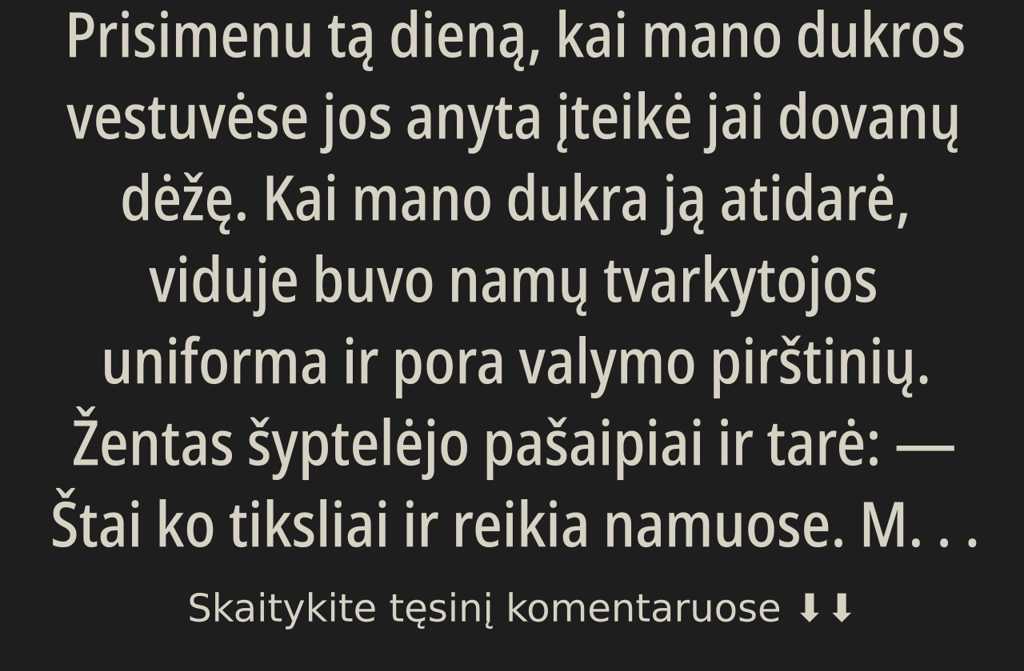 Prisimenu tą dieną, kai mano dukros vestuvėse jos anyta įteikė jai dovanų dėžę. Kai mano dukra ją atidarė, viduje buvo namų tvarkytojos uniforma ir pora valymo pirštinių. Žentas šyptelėjo pašaipiai ir tarė: