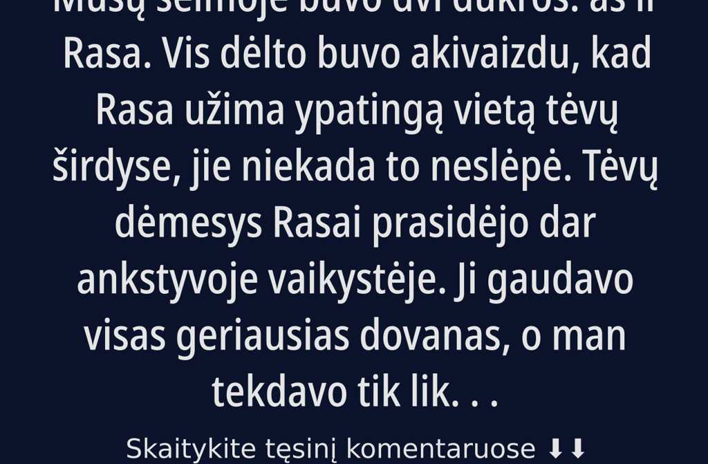 Mūsų šeimoje buvo dvi dukros: aš ir Rasa. Vis dėlto buvo akivaizdu, kad Rasa užima ypatingą vietą tėvų širdyse, jie niekada to neslėpė. Tėvų dėmesys Rasai prasidėjo dar ankstyvoje vaikystėje. Ji gaudavo visas geriausias dovanas, o man tekdavo tik likučiai. Be to, Rasa buvo labai panaši į mūsų tėvus ir turėjo išskirtinį grožį. Tuo tarpu aš buvau panaši į tėčio brolį, kuris, švelniai tariant, nebuvo gražuolis. Net patys tėvai mane dažnai vadino “nepatrauklia”.