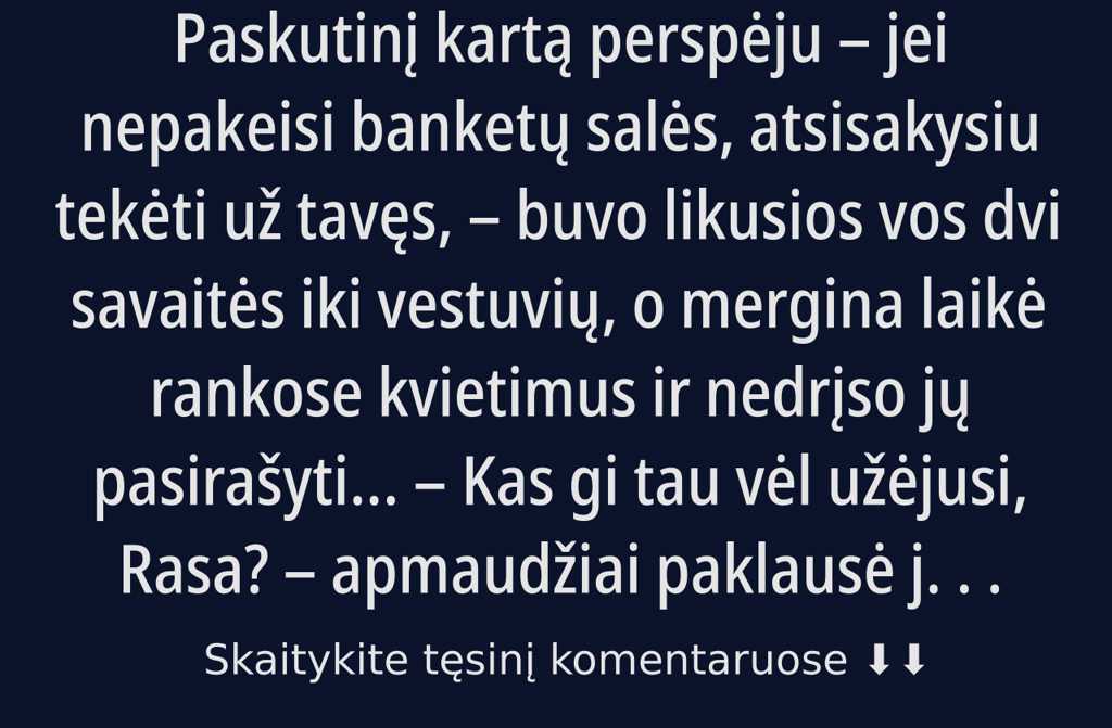 Paskutinį kartą perspėju jei nepakeisi banketų salės, atsisakysiu tekėti už tavęs, buvo likusios vos dvi savaitės iki vestuvių, o mergina laikė rankose kvietimus ir nedrįso jų pasirašyti…