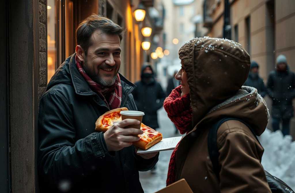 — Ar norėtum kažko paėsti? — ištarian netikėtai net sau. Jis lėtai pakėlė galvą, apžiūrėjo mane neitikėjimu, lyg tikrindamas, ar ne juokauju, ir linktelėjo: „Taip… jei ne per sunku“. Ėjau į kavinę ir užsakiau didelę picos su sūriu ir karštos kavos. Laukiant, žiūrėjau pro langą į jo vienutę besiblaškančioje sutemoje. Grįžęs, ištiesiau maistą. Jo lūpos sudrebėjo silpnai šypsenoje: „Ačiū“, — pašnibždėjo, paimdamas dėžę drebėjančiais, melsvais pirštais.