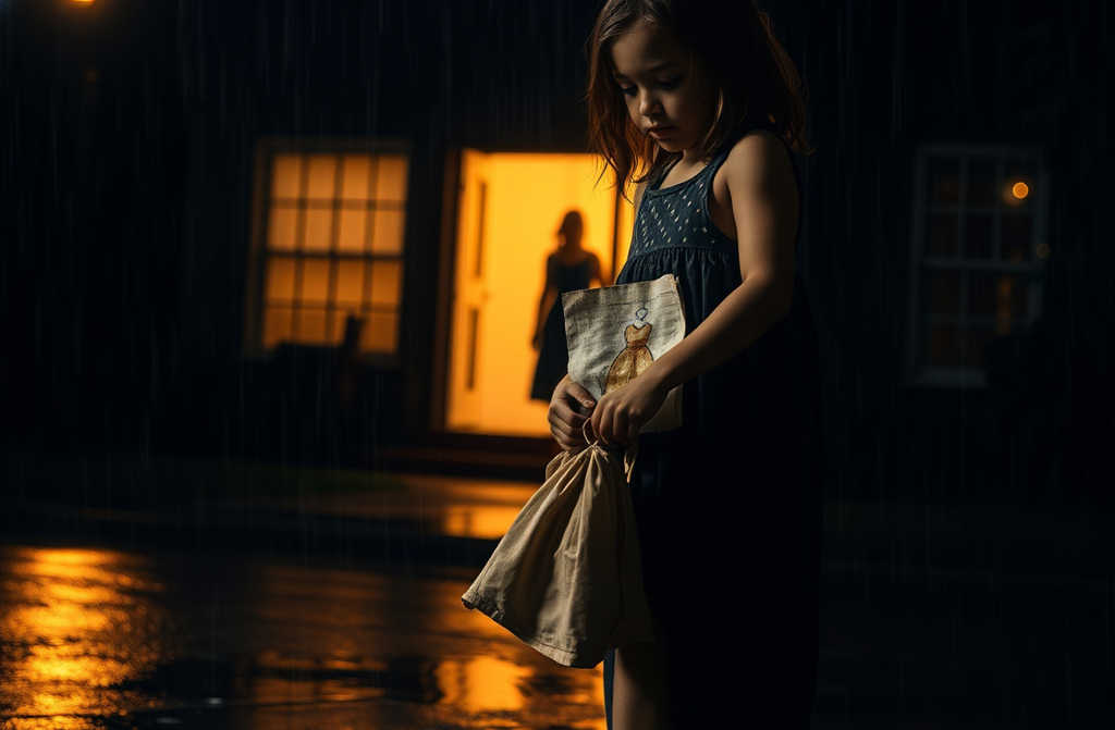 Už jos galvos girdėjosi šauksmai: Išeik! Nesveikas nebūsi man šviečiausios širdies dovanų. Vėtra iškėlė žaibas, atskleidžiančias jos silpną figūrą, klystantį per slidų šaligatvį. Be stogo, be patikimos glėbio, tik plona tikėjimo gija, kad Dievas vis dar žiūri. Šalia, šlapias veidrodis suskilo, lietus sumaišė kraują ant kelio. Ji slaptai paslėpė drėgną pieštuką, kuriame buvo sukurtas suknės skaitmeninis brėžinys, siuvimas auksinėmis linijomis.