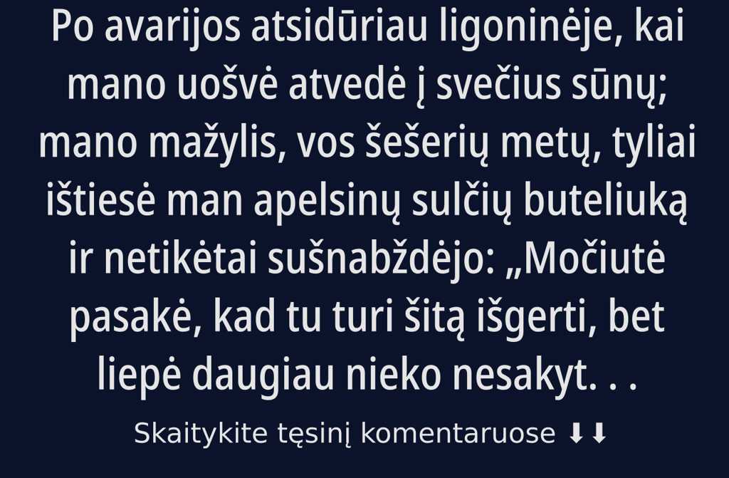 Po avarijos atsidūriau ligoninėje, kai mano uošvė atvedė į svečius sūnų; mano mažylis, vos šešerių metų, tyliai ištiesė man apelsinų sulčių buteliuką ir netikėtai sušnabždėjo: Močiutė pasakė, kad tu turi šitą išgerti, bet liepė daugiau nieko nesakyti.