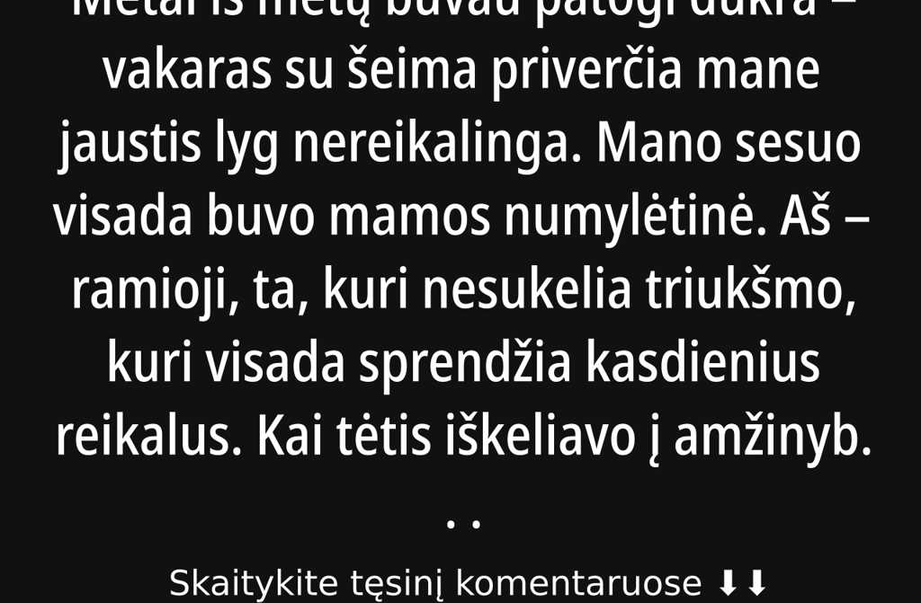 Mano sesuo visada buvo mamos numylėtinė. Aš ramioji, ta, kuri nesukelia triukšmo, kuri visada sprendžia kasdienius reikalus. Kai tėtis iškeliavo į amžinybę, likau su mama Vilniaus daugiabutyje. Sesuo jau gyveno Kaune su vyru, sekmadieniais grįždavo aplankyti.