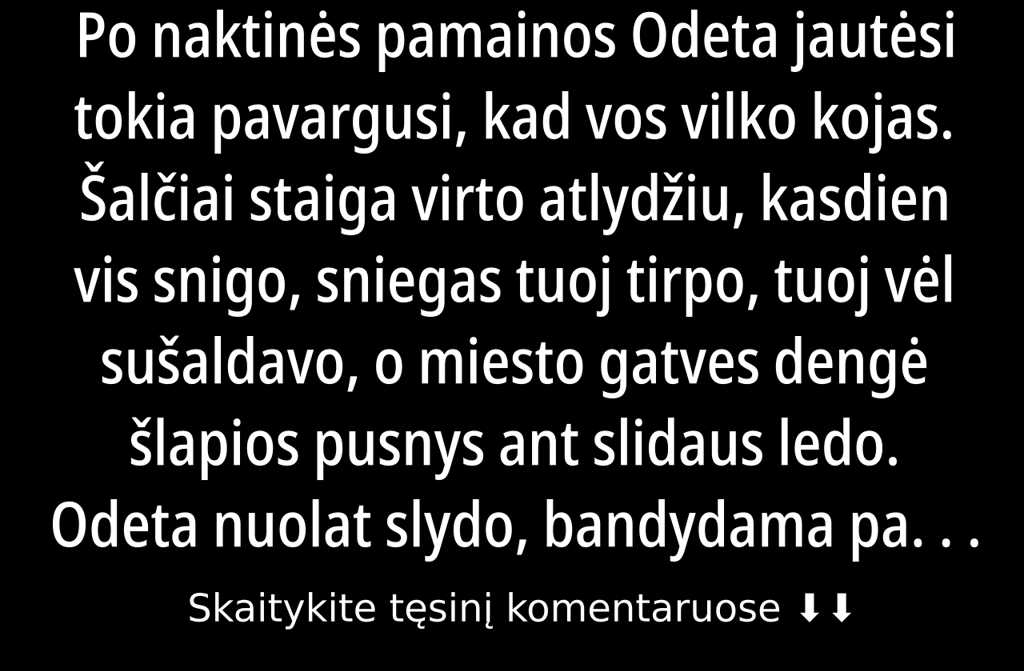 Ir jūs taip. Visi nuo manęs šalinosi. Dievulėliau, kodėl man niekas nebetiki? Vyras užvertė galvą į dangų, ir jo žvilgsnis buvo toks nelaimingas, kad Odetai pagailo. Ji dar kartą nužvelgė jį drabužiai apverktini, bet kalba tvarkinga. Benamiai taip nešneka.