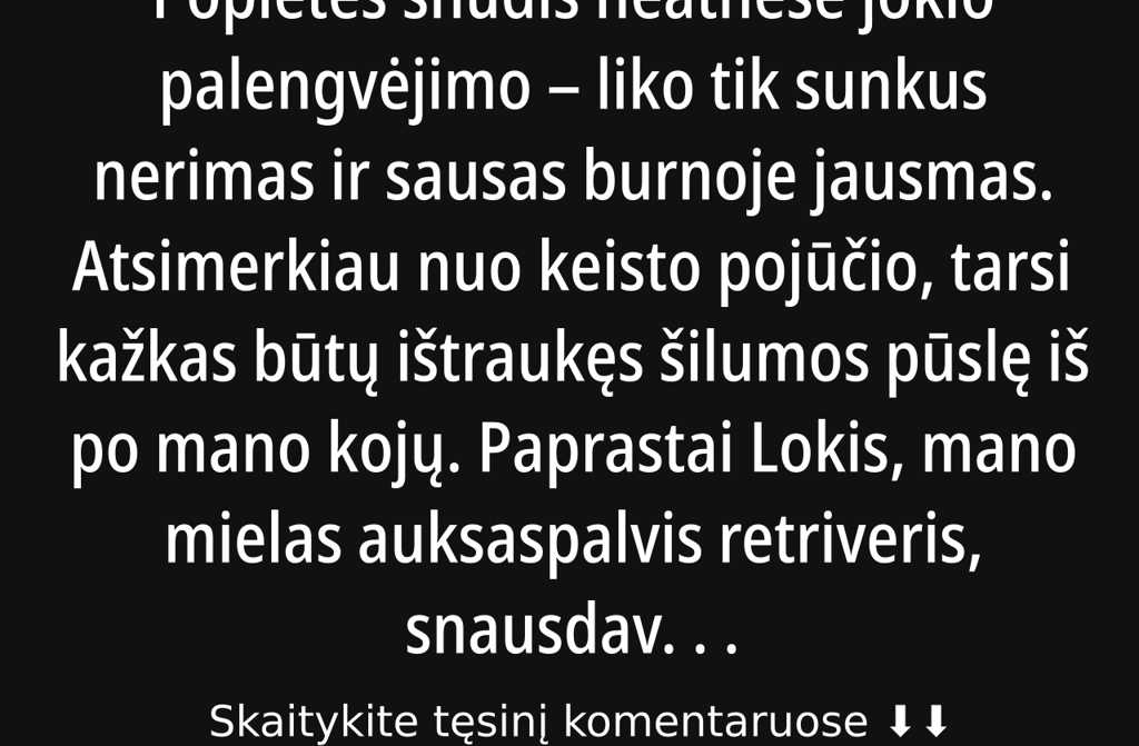Popietės snūdis neatnešė jokio palengvėjimo liko tik sunkus nerimas ir sausas burnoje jausmas. Atsimerkiau nuo keisto pojūčio, tarsi kažkas būtų ištraukęs šilumos pūslę iš po mano kojų. Paprastai Lokis, mano mielas auksaspalvis retriveris, snausdavo šalia, o jo ramus, gilus kvėpavimas migdydavo geriau nei bet kokia valerijonų tinktūra.