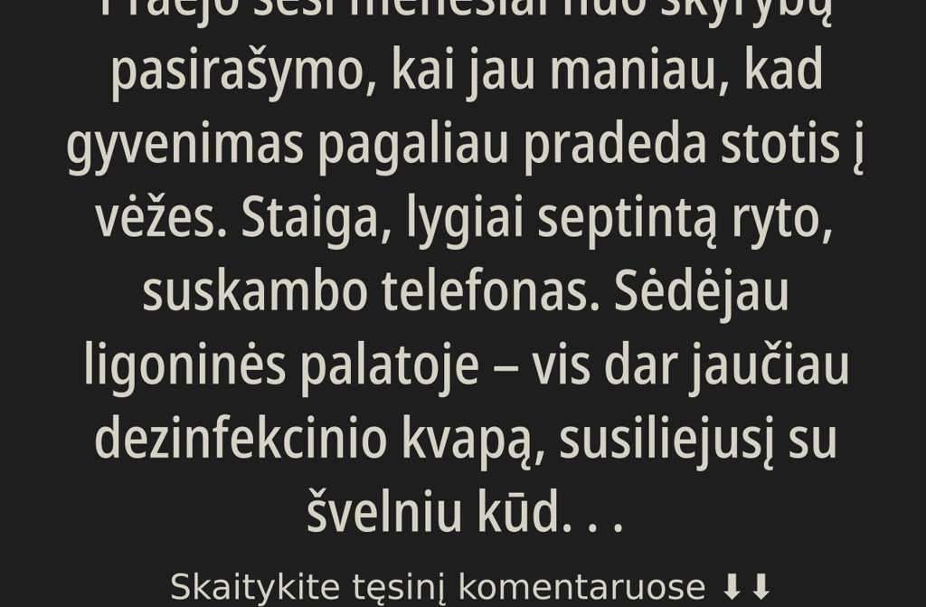 Praėjo šeši mėnesiai nuo skyrybų pasirašymo, kai jau maniau, kad gyvenimas pagaliau pradeda stotis į vėžes. Staiga, lygiai septintą ryto, suskambo telefonas. Sėdėjau ligoninės palatoje vis dar jaučiau dezinfekcinio kvapą, susiliejusį su švelniu kūdikio verksmu. Pažvelgiau į ekraną ir širdis nusirito į kulnus skambino Dovydas, mano buvęs vyras. Atsiliepiau automatiškai, nė neįtardama, ką išgirsiu.