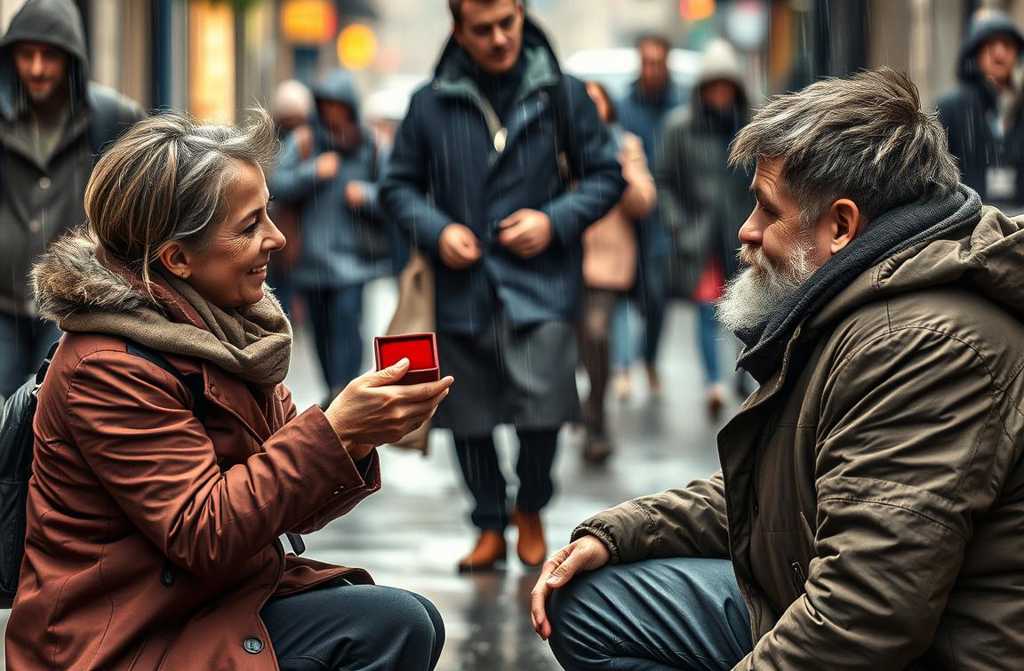 Danguj tyliai varvėjo lietus, tarsi švelnus drobės užuolaidas, o žmonės ėjo pro šalį su atsivertusiais skėčiais ir nuleistomis akimis. Tačiau niekas nepastebėjo moters beige kostiume, kuri, stovėdama sankryžos viduryje, nusileido ant kelių. Jos balsas drebėjo. Prašau tekėk už manęs, sušnibždėjo ji, laikydama aksomo dėžutę rankose. Vyras, kuriam ji darė pasipiršimą? Savaitėmis nesibravęs, vilkintis klijuote aptaisytą paltą, miegojęs skverelyje vos už keliolikos metrų nuo Gedimino prospekto.