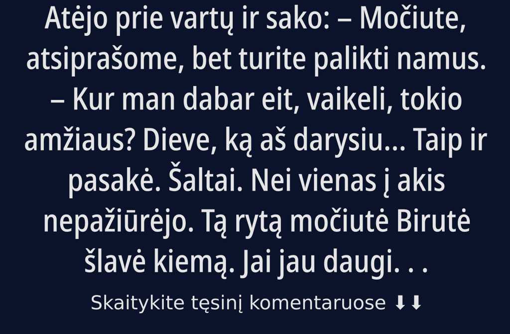 Tą rytą močiutė Birutė šlavė kiemą. Jai jau daugiau nei septyniasdešimt, o visas gyvenimas suspaustas tarp tos trobelės sienų. Ten gimė jos vaikai. Ten atgulė jos vyras. Ten ji išgyveno ir džiaugsmus, ir visas nuoskaudas.