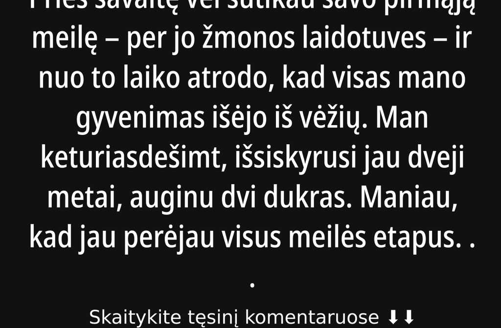 Ir štai aš keturiasdešimties, dviejų vaikų mama, atrodo, ramiu ir tvarkingu gyvenimu, bet jaučiuosi vėl kaip ta septyniolikmetė Rūta, kuri tada įsimylėjo pirmąkart. Nežinau, ar čia nostalgija, ar liūdesys dėl to, ko nebuvo, ar tiesiog natūralu, kad pirma meilė sugrąžina tai, ką manėme jau palaidoję.