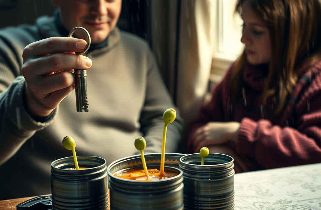 Ant palangės padėjo tris tuščias konservų skardines nuo lašinių, į jas pabėrė žemės iš kiemo šalia namo. Sukrovė kelis svogūno svogūnėlius. Net ne daržas tai buvo trys skardinės gyvybės, už kurias bent kažkas dabar prie jo priklausė.