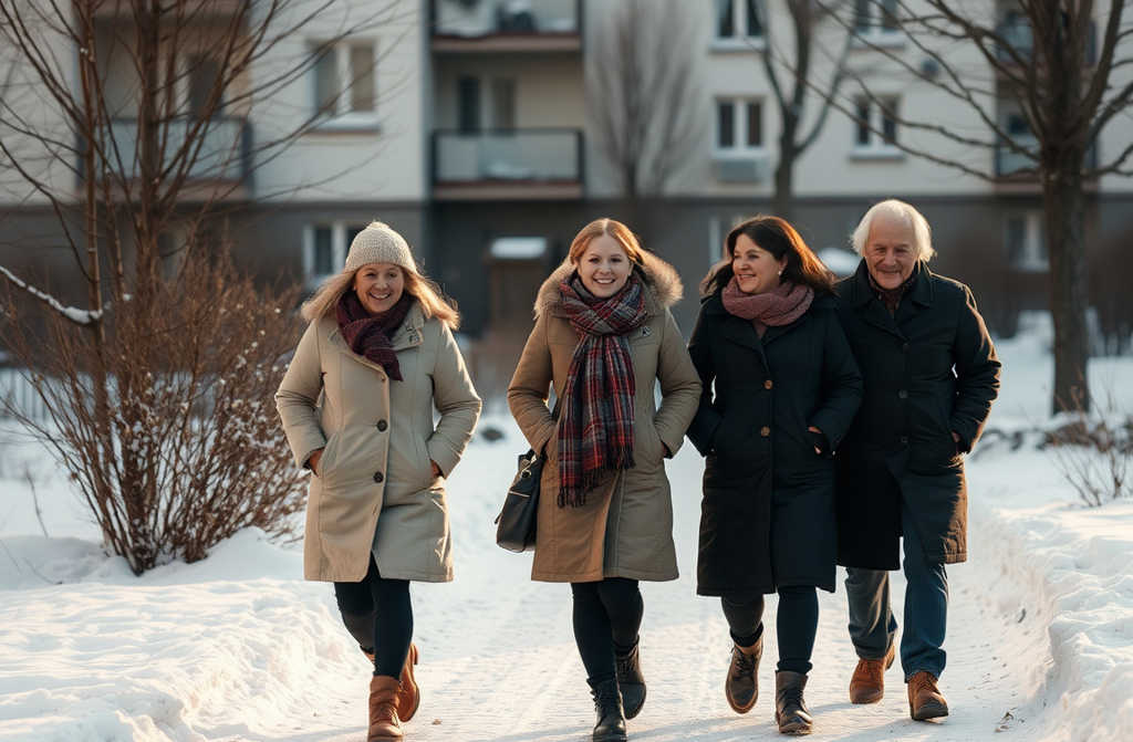 7:16 jie išeina. Nijolė specialiai pasirinko paprastą maršrutą: aplink kvartalą, pro parduotuvę, per kiemą prie kito namo, palei mokyklą ir atgal. Sniegas po kojomis suplūktas, vietomis slidu. Kvepia šaltu oru, pirmos minutės visi tyli, klausosi savo žingsnių.