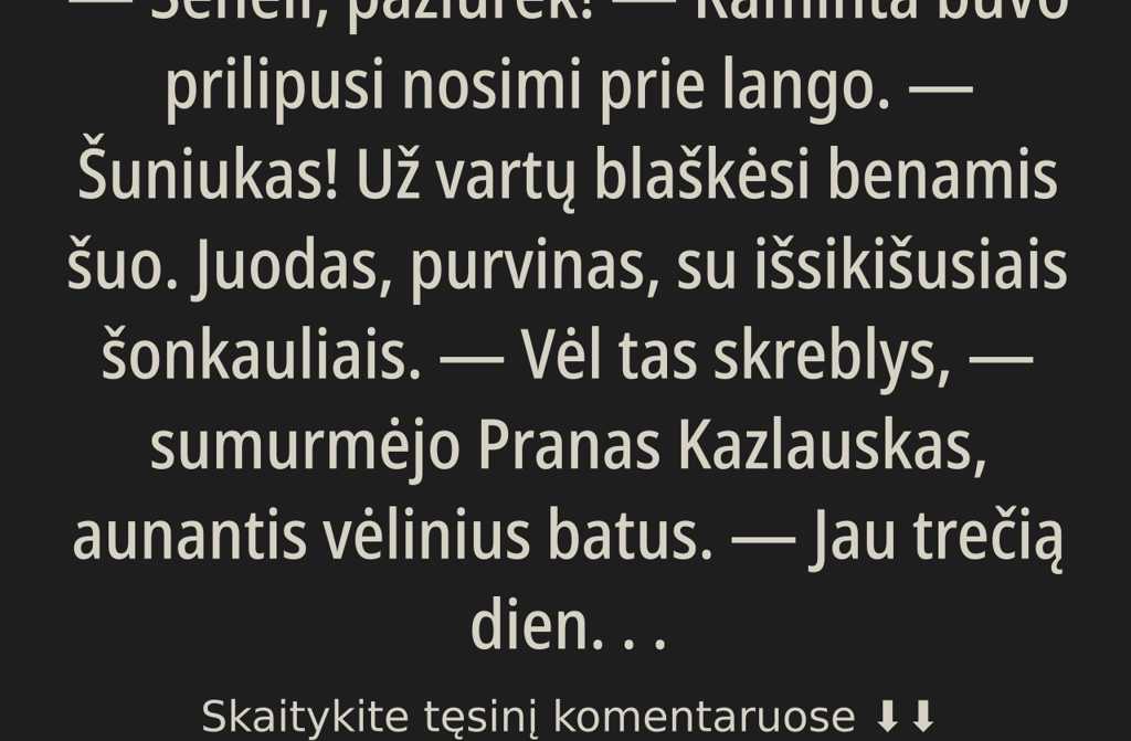 Vėl tas skreblys, sumurmėjo Pranas Kazlauskas, aunantis vėlinius batus. Jau trečią dieną sukasi. Eik, eik sau!
