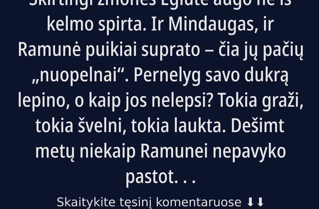 Mindaugui pasaulis nuvirto. Taip ir sakė: Kaip, Ramunė? Ji net nežino, kas yra gyvenimas visą laiką tik mergaitei ir namams!