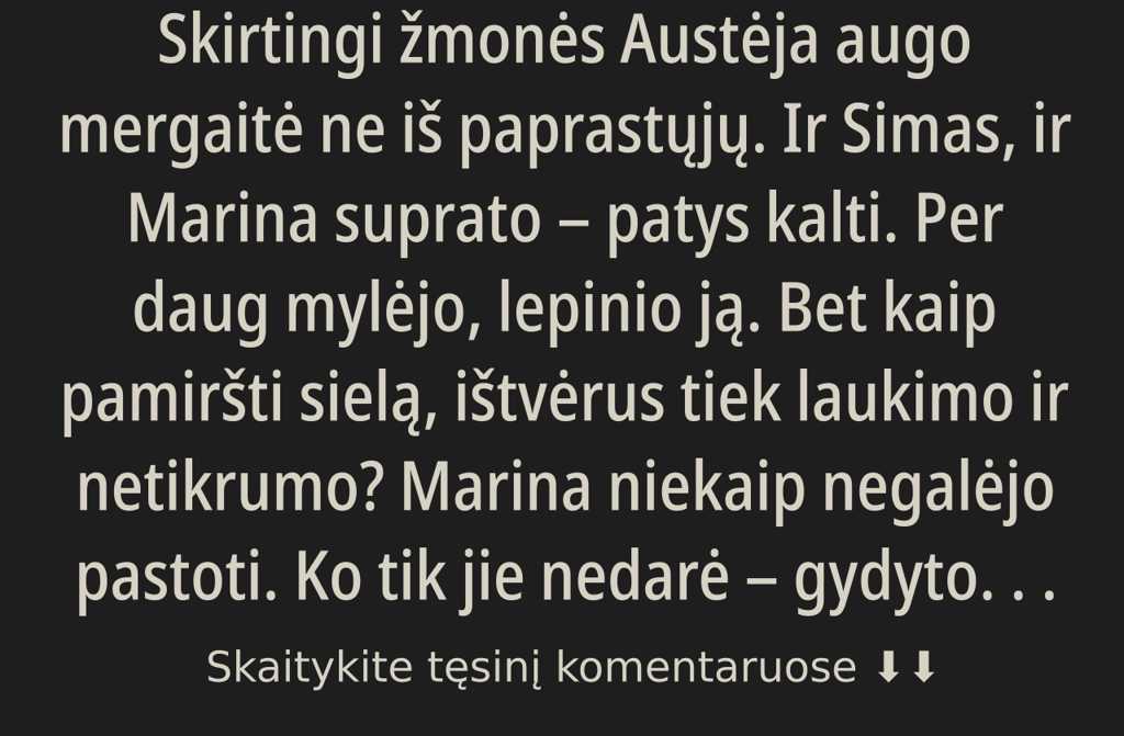 Austėja paaugo, tapo savarankiška, Marina nuėjo dirbti į miestelio gamyklą ten mokėjo daugiau. Dvi algos ir gal vėl atgis sena svajonė.