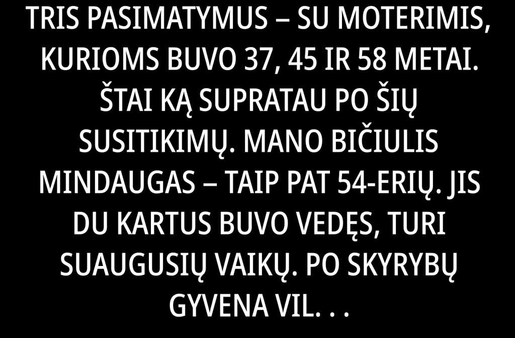 Man 54-eri. Per цей laiką turėjau tris pasimatymus su moterimis, kurioms buvo 37, 45 ir 58 metai. Štai ką supratau po šių susitikimų.