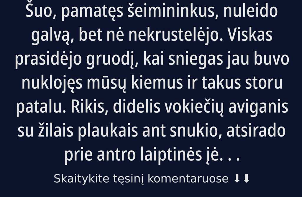 Rikis, didelis vokiečių aviganis su žilais plaukais ant snukio, atsirado prie antro laiptinės įėjimo visai staiga. Lyg būtų įkritęs iš pačios žiemos tyloje.