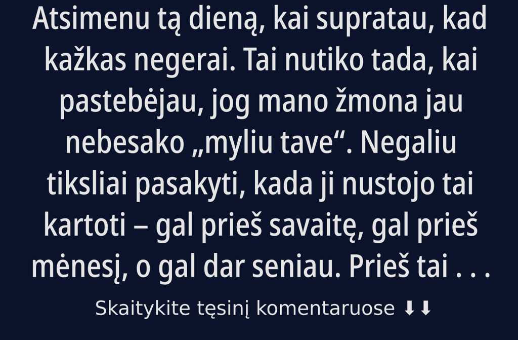 Pradėjau pastebėti pokyčius mažose detalėse. Nebeatsiųsdavo žinučių dienos metu anksčiau rasdavau jos žinutes: saugok save, geros dienos, ar valgai pietus. Nuo tada nė vieno žodžio. Vakare ji atsigulusi žiūrėdavo į telefoną, nusisukusi nuo manęs. Nebeieškojo mano rankos. Nebepaklausdavo, kaip jaučiuosi. Vieną vakarą pasakiau jai meile, o ji atsakė tik vardu Vytautai. Tą akimirką pajutau keistą sunkumą krūtinėje.