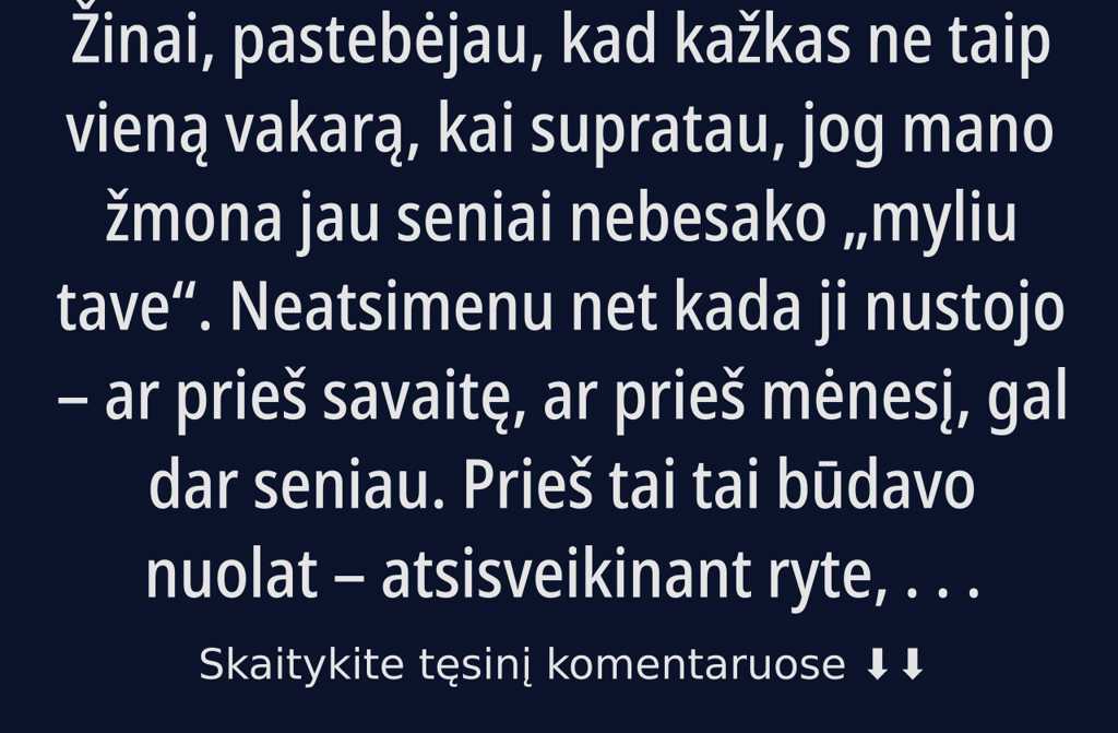 Pokyčius pajutau smulkmenose. Dabar dienos metu ji man neberašo žinučių. Anksčiau siųsdavo: pasaugok save, geros dienos, ar jau pavalgei. Dabar tyla. Vakare guli nugara į mane, akys į telefoną. Nebeieško mano rankos, nebepaklausia, kaip jaučiuosi. Vieną dieną jai pasakiau meile, o ji atsakė mano vardu Vaidai. Tą akimirką kažkas suspaudė krūtinę, lyg spaustų.